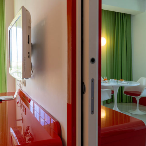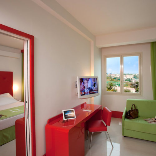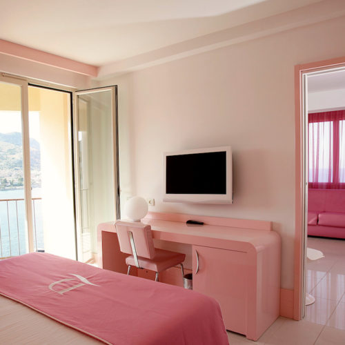 Una camera di prestigio, ampia e luminosa, con una vista mare mozzafiato che ben si armonizza con il design allegro e luminoso degli interni. Un comodo salottino anticamera e una spaziosa camera da letto. Da uno a due bagni.