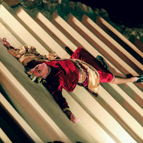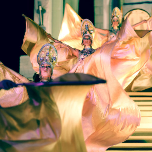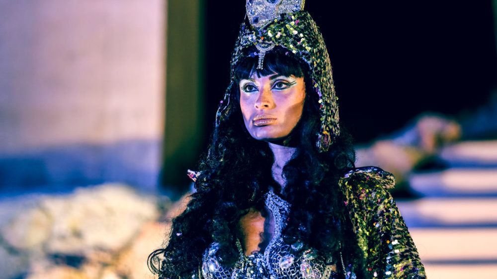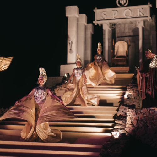 Рим приветствует царицу Египта празднествами, и Цезарь, чтобы почтить ее присутствие и узаконить их союз, решает воздвигнуть золотую статую Клеопатры, представляющую богиню Исиду.